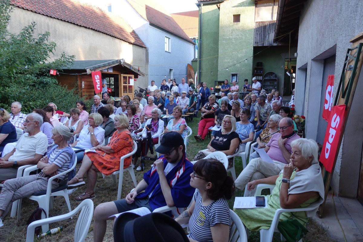 Schnell waren die vorhandenen Plätze vergeben und die zahlreichen Gäste genossen einen lauschigen, unterhaltsamen Sommerabend. Darunter auch stellvertretender Landrat Michael Rischke und Alt-MdL Reinhold Strobl. SPD-Vorsitzender Günther Amann dankte Renée Ehringer-Hoffmann und ihrem Gatten Dieter für ihre Gastfreundschaft und dafür, dass zum ersten Mal eine solche Veranstaltung an diesem Ort stattfinden konnte. Der Erfolg mache Lust auf mehr. Amann verwies auf die mehr als 3000 Exponate im Steingutmuseum, die im Anschluss besichtigt werden könnten.
